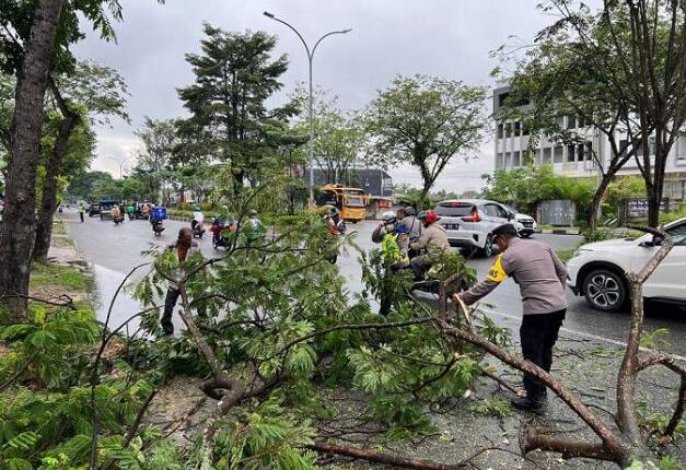 “Petugas kepolisian yang mendapatkan informasi, bahwasa ada sebuah pohon tumbang yang mengganggu kelancaran arus lalu lintas, tepatnya di Jalan Arifin Achmad tepatnya di depan SD Al Azhar Pekanbaru. Petugas langsung menuju ke lokasi dan juga mengevakuasi pohon tumbang itu bersama masyarakat,” kata Angga, Senin (7/11/2022).