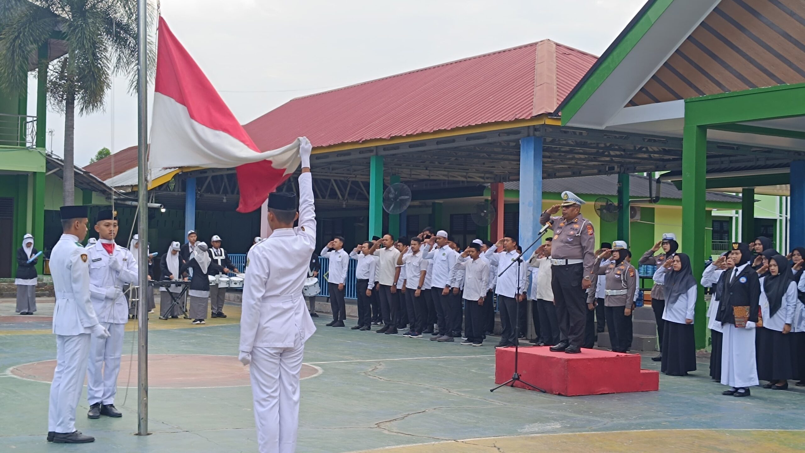 Kegiatan tersebut dipimpin langsung oleh Kasubdit Kamsel Ditlantas Polda Riau, AKBP Dasril, S.Pd., M.M., yang bertindak sebagai pembina upacara. Upacara diikuti oleh 124 guru dan 1.087 siswa, serta didukung oleh personel Subdit Kamsel Ditlantas Polda Riau.
