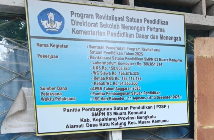 Proyek revitalisasi satuan pendidikan sekolah dasar di SMPN 03 Muara Kemumu yang bersumber dari APBN tahun anggaran 2025 , yang seharusnya meningkatkan fasilitas pendidikan, kini menjadi sorotan tajam setelah muncul dugaan praktik korupsi oleh oknum kepala sekolah SMPN 03 MUARA Kemumu kabupaten Kepahiang.