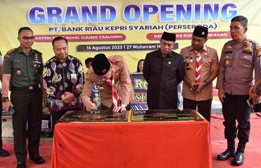 Grand Launching Kantor BRK Syariah tersebut ditandai dengan penandatanganan prasasti oleh Bupati Rokan Hilir, Afrizal Sintong dan pengguntingan pita oleh Ketua PKK Kab. Rokan Hilir Sanimar Afrizal, disaksikan Direktur Operasional BRK Syariah, Said Syamsuri, Sekretariat Daerah Kab. Rokan Hilir, H. Fauzi Efrizal, Dandim 0321 Rokan Hilir, Letkol Kav Nugraha Yudha Prawiranegara, Wakil Ketua DPRD Kab. Rokan Hilir, Basyirun Nur Effendi serta Kapolsek Tanah Putih Kompol D. Sianturi, bertempat di Kantor BRK Syariah Rohil Ujung Tanjung, Senin, (14/8/2023).