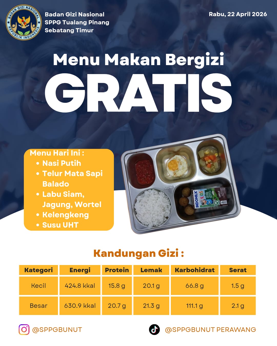 “Kami memastikan bahwa menu yang disalurkan hari ini sudah memenuhi Angka Kecukupan Gizi (AKG). Untuk porsi kecil, mengandung energi sebesar 424,8 Kkal dan protein 15,8 gram. Sementara untuk porsi besar, kami tingkatkan hingga 630,9 Kkal dengan protein mencapai 20,7 gram,” jelas Fadila.