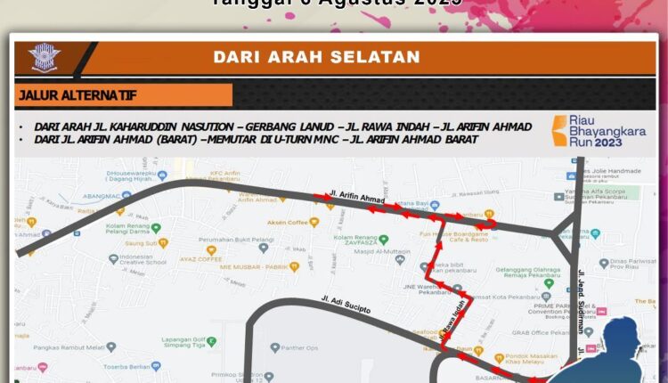 DERAKPOST.COM – Rute pengalihannya arus lalu lintas di Kota Pekanbaru, akan dialami pengendara selama event Riau Bhayangkara Run. Dikarena di sejumlah ruas jalan akan dialihkan pada tanggal 6 Agustus 2023.