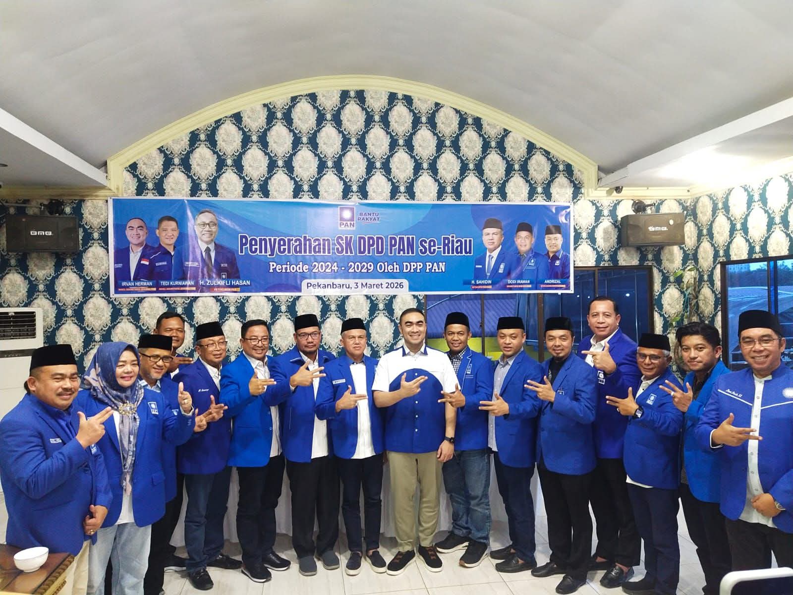 Penyerahan SK dilakukan oleh Wakil Sekjen DPP PAN Irvan Herman dan Kepala Sekretariat DPP PAN Arif Nuar Hartanto alias Inung kepada Ketua DPW PAN Provinsi Riau H. Sahidin, yang selanjutnya diserahkan ke masing-masing Ketua DPD PAN se Provinsi Riau.