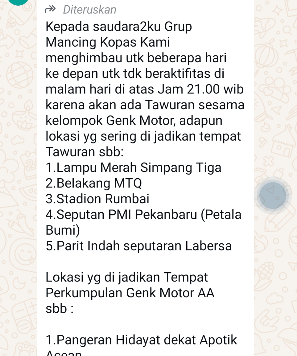 “Kepada saudara2ku Kami menghimbau utk beberapa hari ke depan utk tdk beraktifitas di malam hari di atas Jam 22.00 wib karena di perkirakan akan ada Tawuran sesama kelompok Genk Motor,” isi pesan itu mengawali.