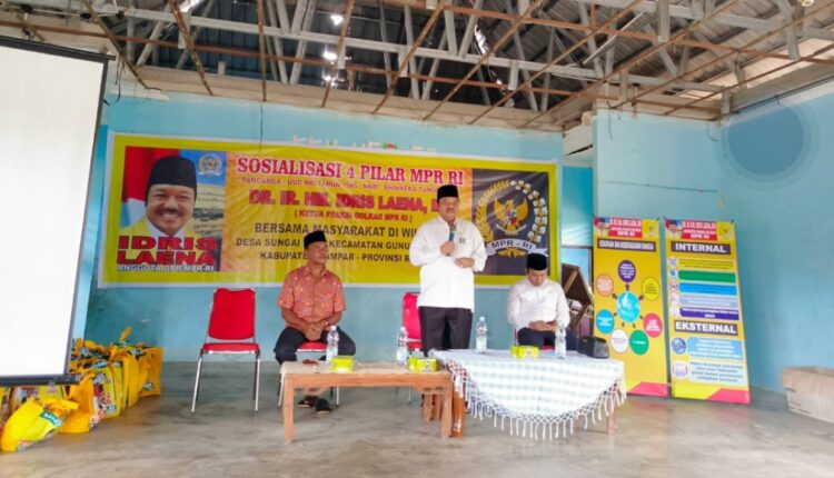 DERAKPOST.COM – Anggota DPR/MPR RI Idris Laena, menggelar Sosialisasi 4 Pilar. terhadap masyarakat Desa Sungai Lipai di Kecamatan Gunung Sahilan, di Kabupaten Kampar dengan harapanya jaga persatuan dan kesatuan, khususnya menjelang acara Pemilu tahun 2024.