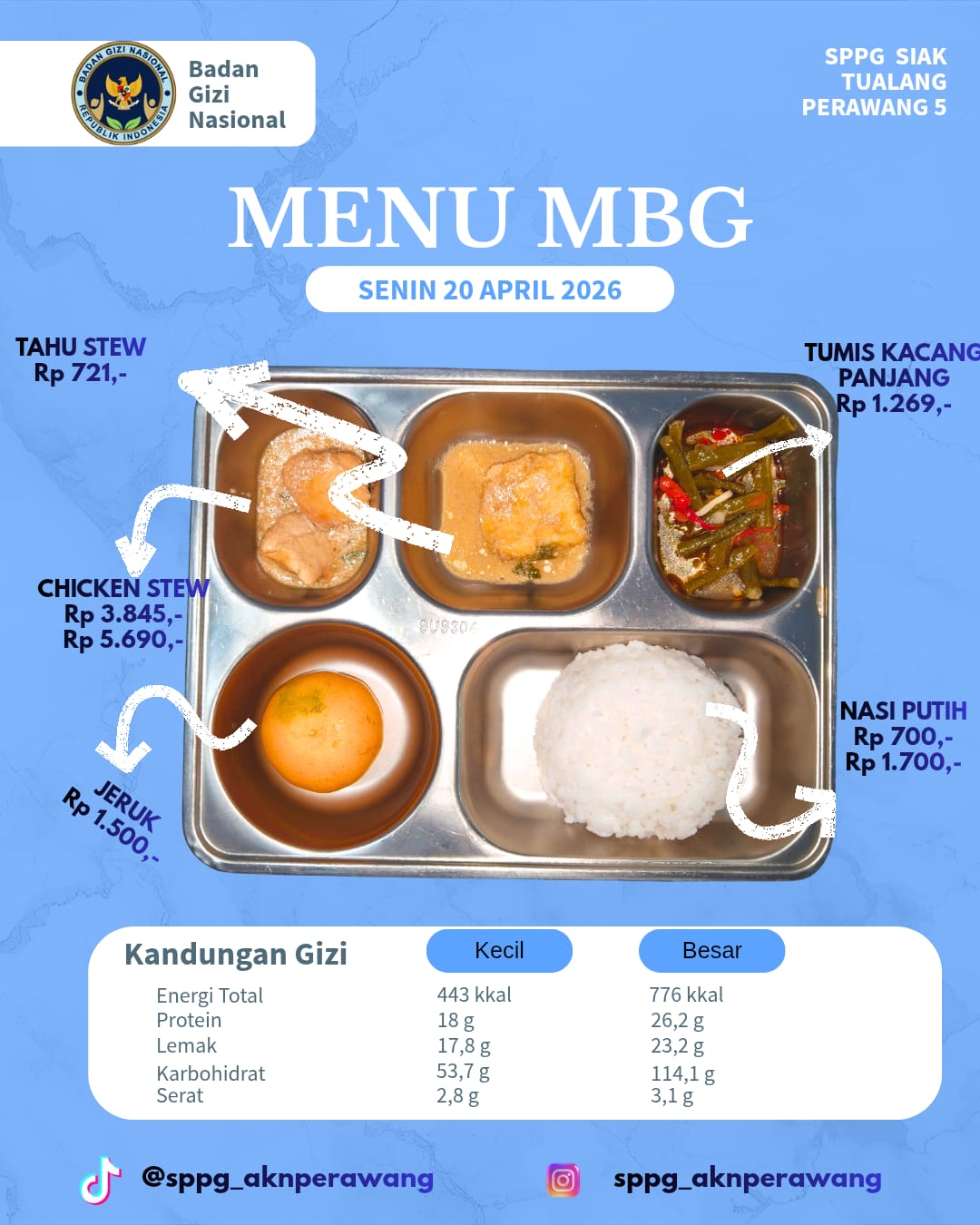 Dalam pantauan lapangan pada penyaluran “SPPG Tualang Perawang 5”, menu yang disajikan mengedepankan gizi seimbang yang terdiri dari: