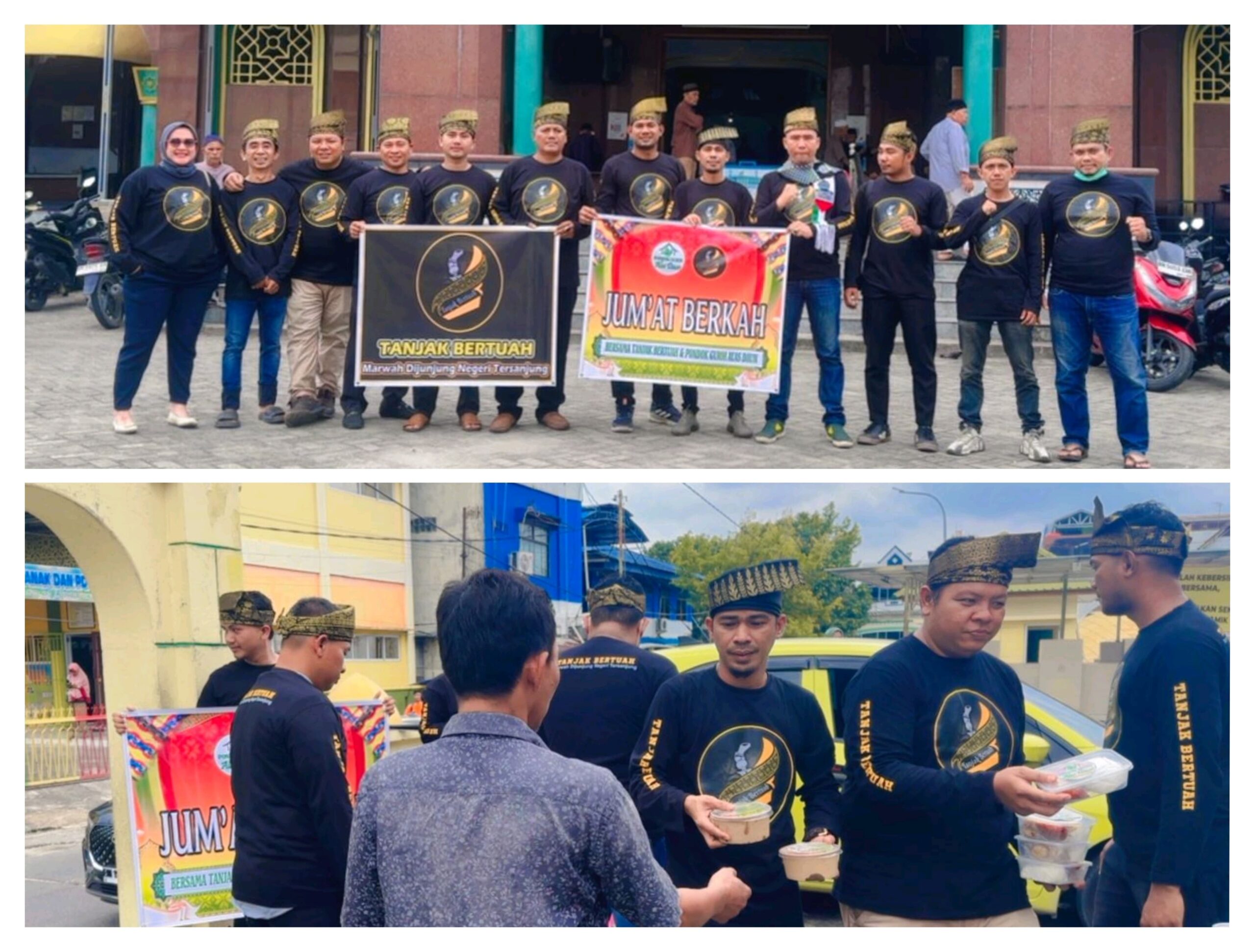 Dengan mengenakan busana serba hitam bertanjak emas, para anggota Tanjak Bertuah tampak kompak dan penuh semangat saat membagikan paket makanan kepada jamaah serta masyarakat sekitar masjid.