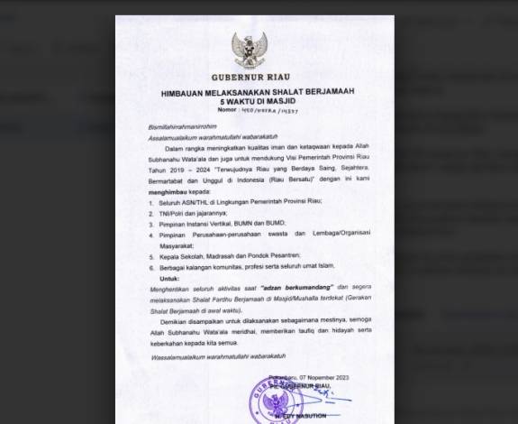 “Iya, pimpinan Pak Plt Gubernur Riau ini telah mengeluarkan surat imbauan salat berjamaah 5 waktu di masjid/musala,” ujarnya .