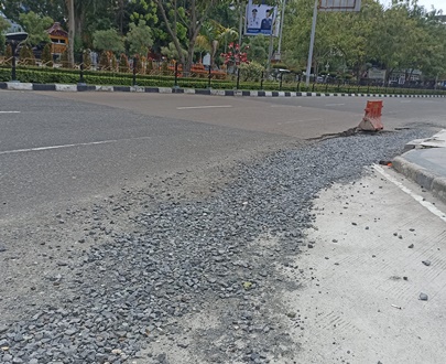 Ngerinya lagi, material yang merupakan batu kecil-kecil bercampur tanah dan pasir itu sangat mudah tergelincir. Ceceran material tersebut sangat licin saat dilindas dan dapat membahayakan pengendara terutama roda dua. Ceceran material itu tampak dari halte RTH Putri Kaca Mayang hingga simpang pintu masuk RTH.