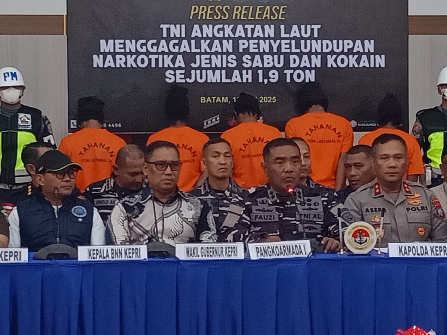 DERAKPOST.COM – Wakil Gubernur (Wagub) Kepulauan Riau, Nyanyang Haris Pratamura saat menghadiri konferensi pers pengungkapan narkotika di Mako Lantamal IV Batam, Tanjung Sengkuang, Jumat (16/5/2025).