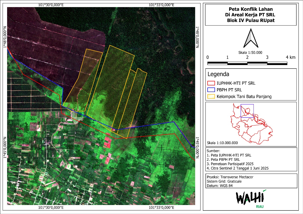 Berdasarkan hasil pantauan dan analisis spasial WALHI Riau periode November 2023 s/d September 2025 di lokasi konsesi PT SRL menemukan bahwasa perusahaan tersebut jadi sumber konflik lahan dengan masyarakat daerah Kabupaten Bengkalis, Kepulauan Meranti, dan Indragiri Hilir. Dan konsesinya berulang kali terbakar, merusak ekosistem gambut, dan tidak menjalankan kewajiban restorasi gambut.