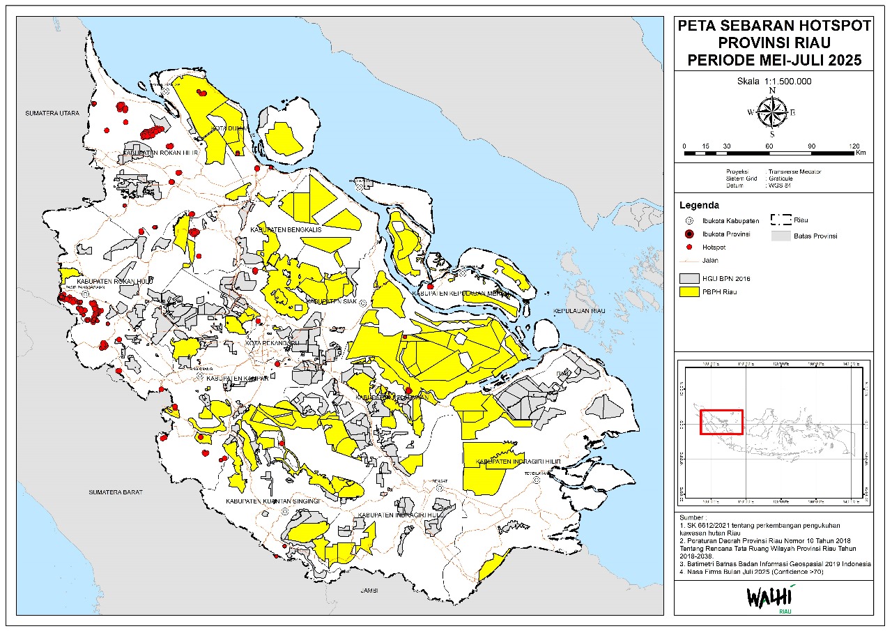 Kebakaran hutan dan lahan (karhutla) yang saat ini tidak saja terjadi di Riau, tapi hampir seluruh provinsi di Indonesia. Hal ini merupakan bukti nyata bagaimana Presiden Prabowo gagal mencegah karhutla di Indonesia. Berdasarkan data Sipongi Kementerian Kehutanan (Kemenhut), hingga Juni 2025 karhutla telah terjadi di 27 provinsi di Indonesia dengan total 8.594,49 ha. Hal ini diperkuat dengan data Badan Meteorologi, Klimatologi dan Geofisika (BMKG) yang menyebutkan bahwa sepanjang tahun 2025 telah terjadi 120 peristiwa karhutla di Indonesia.