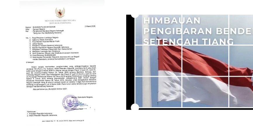 “Dimohon untuk mengibarkan Bendera Negara setengah tiang di seluruh pelosok tanah air selama tiga hari berturut-turut terhitung mulai tanggal 2 s.d. 4 Maret 2026,” ungkap Mensesneg. Selain itu, pemerintah juga menetapkan tanggal 2 s.d. 4 Maret 2026 sebagai Hari Berkabung Nasional. (Dairul)