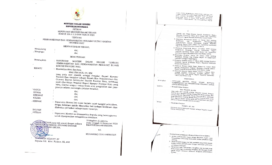 Surat tertanggal 13 Desember 2023 itu, Mendagri Tito Karnavian dengan resmi memberhentikan Firdaus dari jabatanya dan mengangkat Hambali yang merupa Sekretaris Daerah (Sekda) Kampar jadi Penjabat Bupati Kampar.
