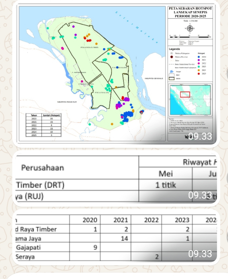 Tidak saja tahun ini, dua perusahaan ini merupakan langganan karhula yang hampir setiap tahun ditemukan hotspot di areal kerja mereka. Terlebih PT DRT, sepanjang enam tahun terakhir hanya pada tahun 2022 tidak ditemukan hotspot di konsesi perusahaan tersebut. Selain perusahaan ini, riwayat karhutla di lanskap senepis juga terjadi di lokasi perizinan lainnya, yaitu PT Suntara Gajapati (SGP) dan PT Sindora Seraya. Berikut riwayat hotspot di lanskap senepis dalam areal kerja korporasi.